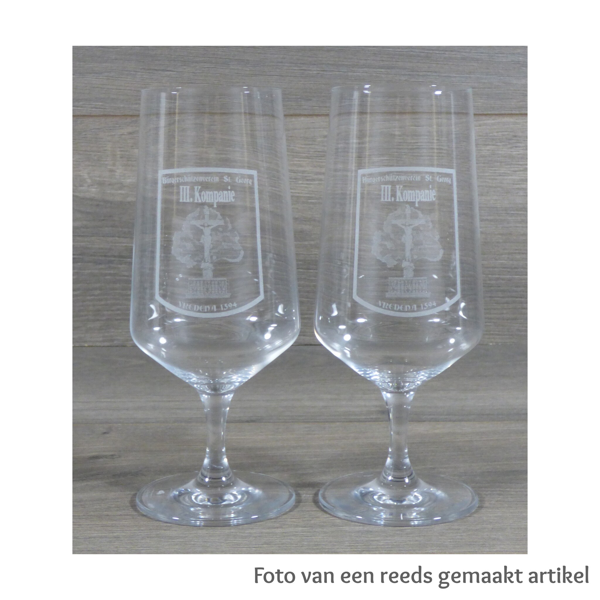 Deze sierlijke bierglazen laten graveren met jouw eigen naam of tekst is een geweldig uniek cadeau. Ze worden gegraveerd met een hoogwaardige lasertechniek. Zo kun je heel lang genieten van je speciale bierglas! Het glas is 18,6 cm hoog en heeft een doorsnede van 7,3 cm. De inhoud is 410 ml. Gemaakt van mooi kristal helder glas en is vaatwasmachine bestendig.