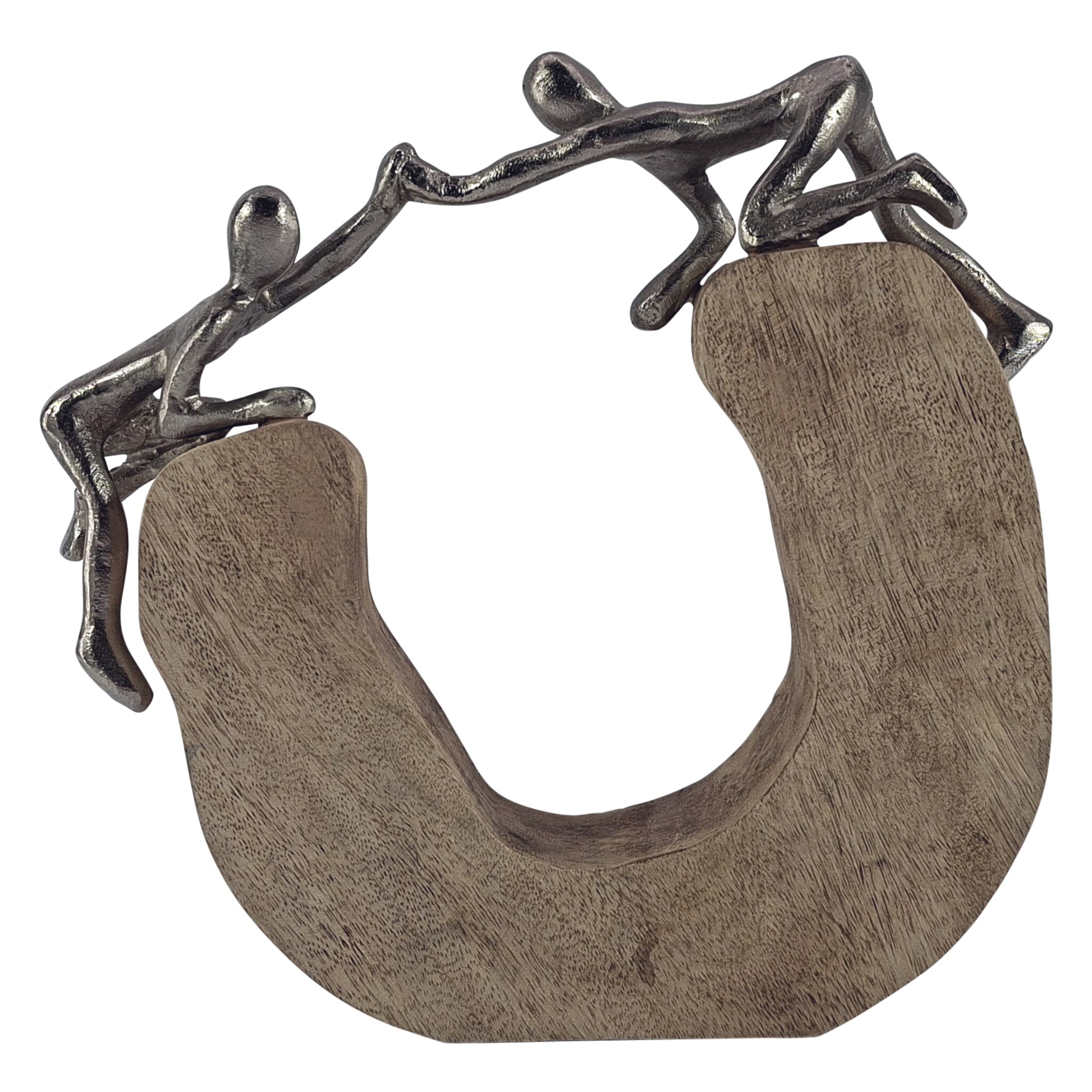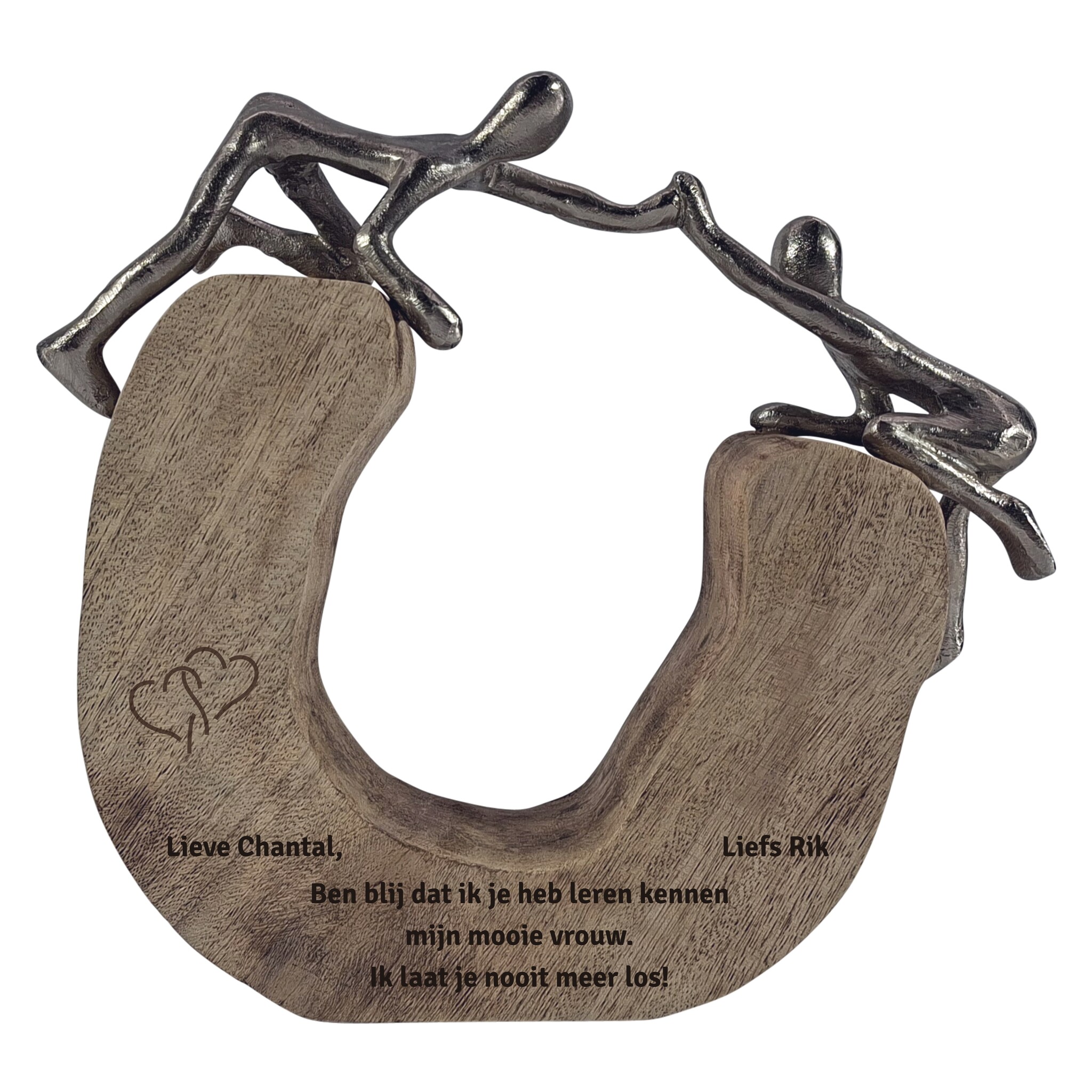 Dit prachtige beeld van mangohout en aluminium symboliseert hoe we elkaar kunnen ondersteunen en aanmoedigen. Laat het extra persoonlijk maken door graveren – een warm en betekenisvol geschenk dat blijvend inspireert. Lees meer