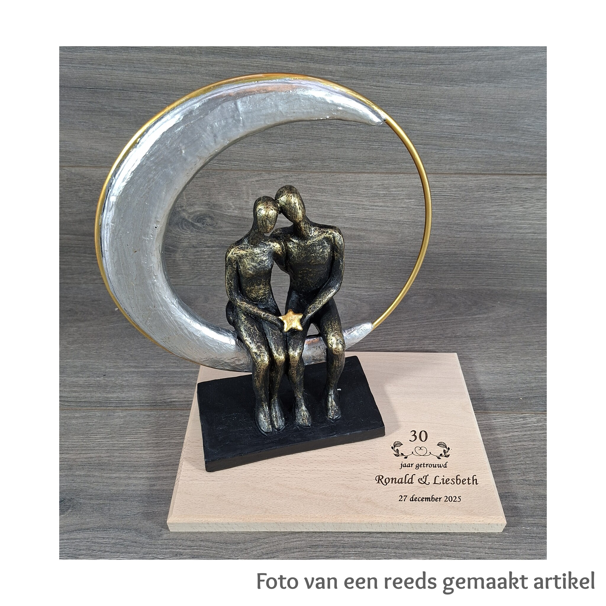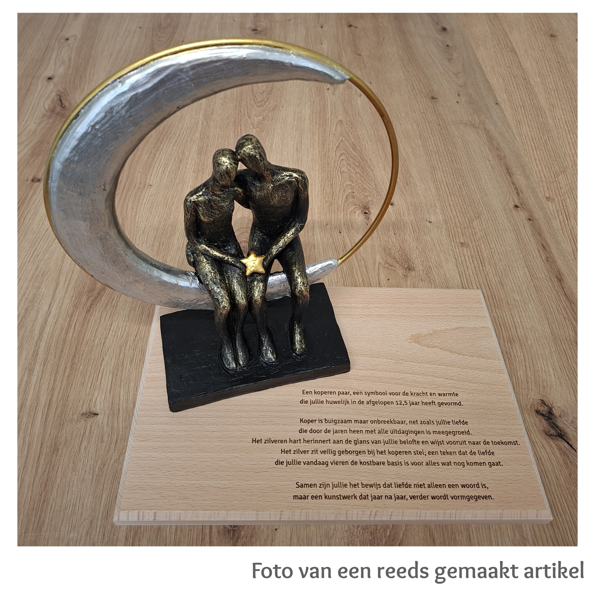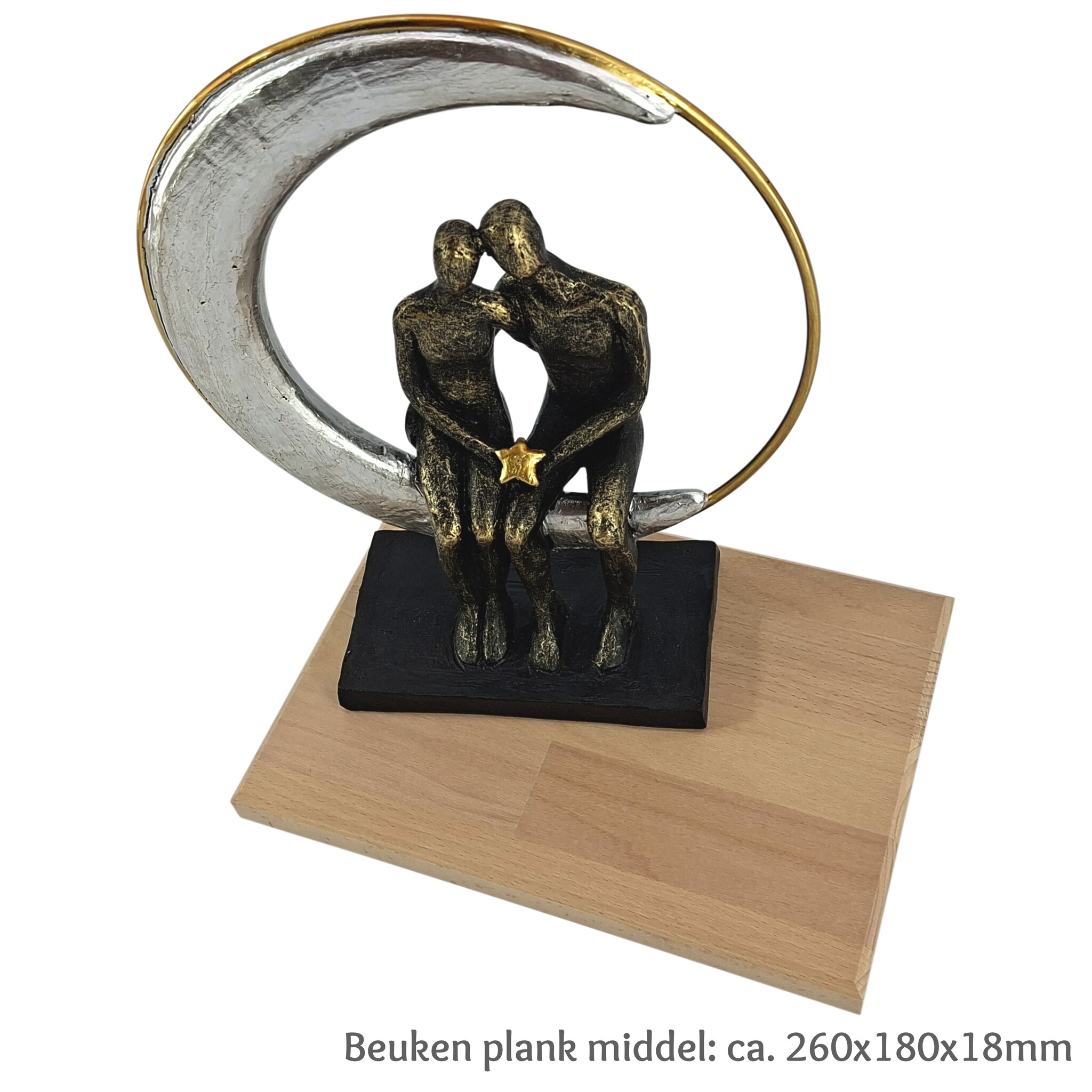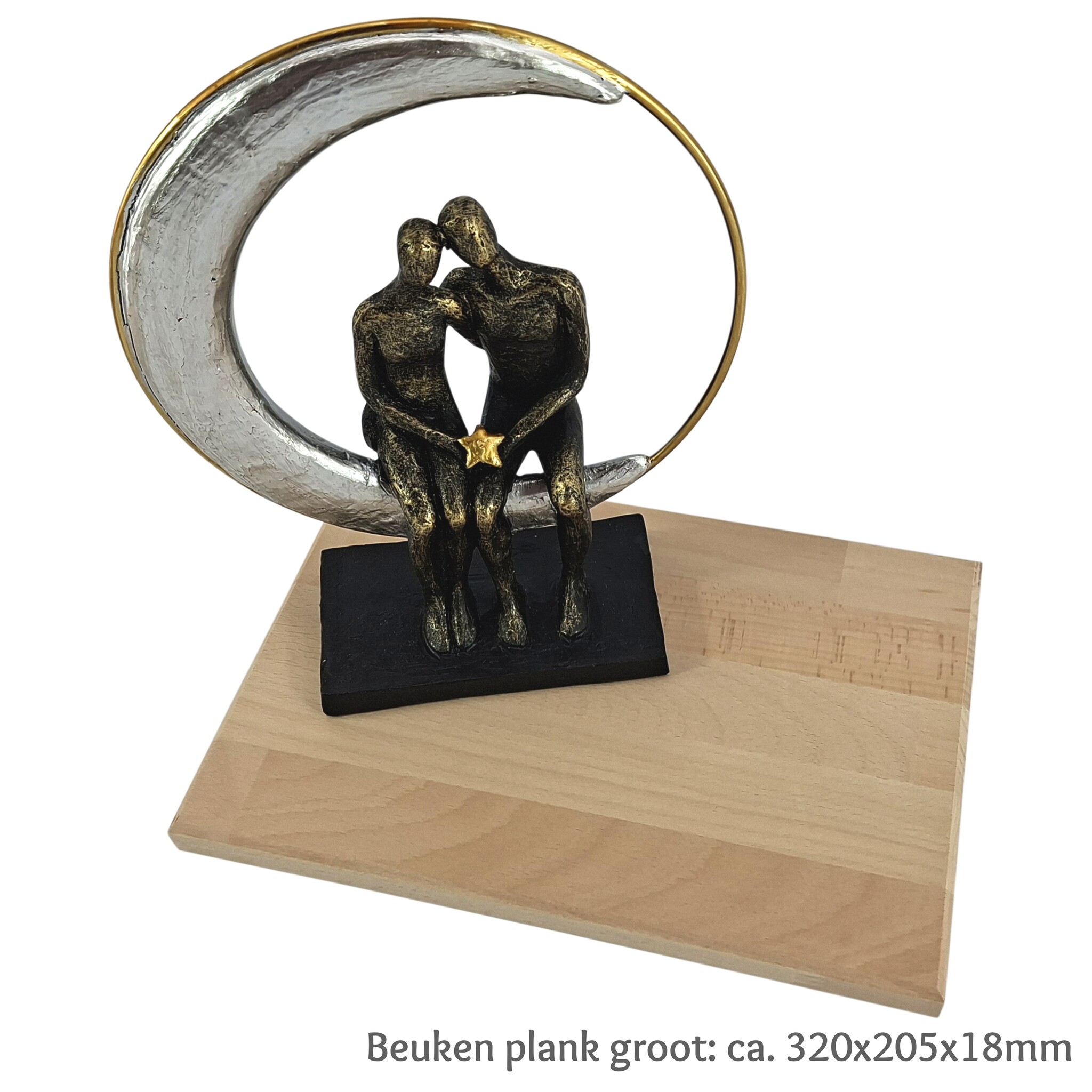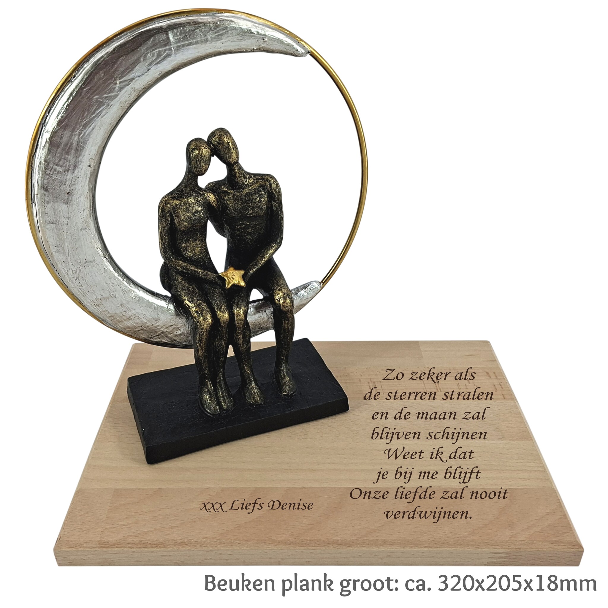 Vier uw echte liefde met dit verfijnde beeld van kunsthars, prachtig gegraveerd en gepresenteerd op een duurzame beuken plank. Elk detail straalt warmte, vakmanschap en emotie uit. Dit kunstwerk is een blijvende herinnering aan verbondenheid en tederheid – ideaal als cadeau voor een bijzonder moment of als stijlvolle decoratie in uw interieur. Laat liefde tot leven komen in een tastbare vorm.