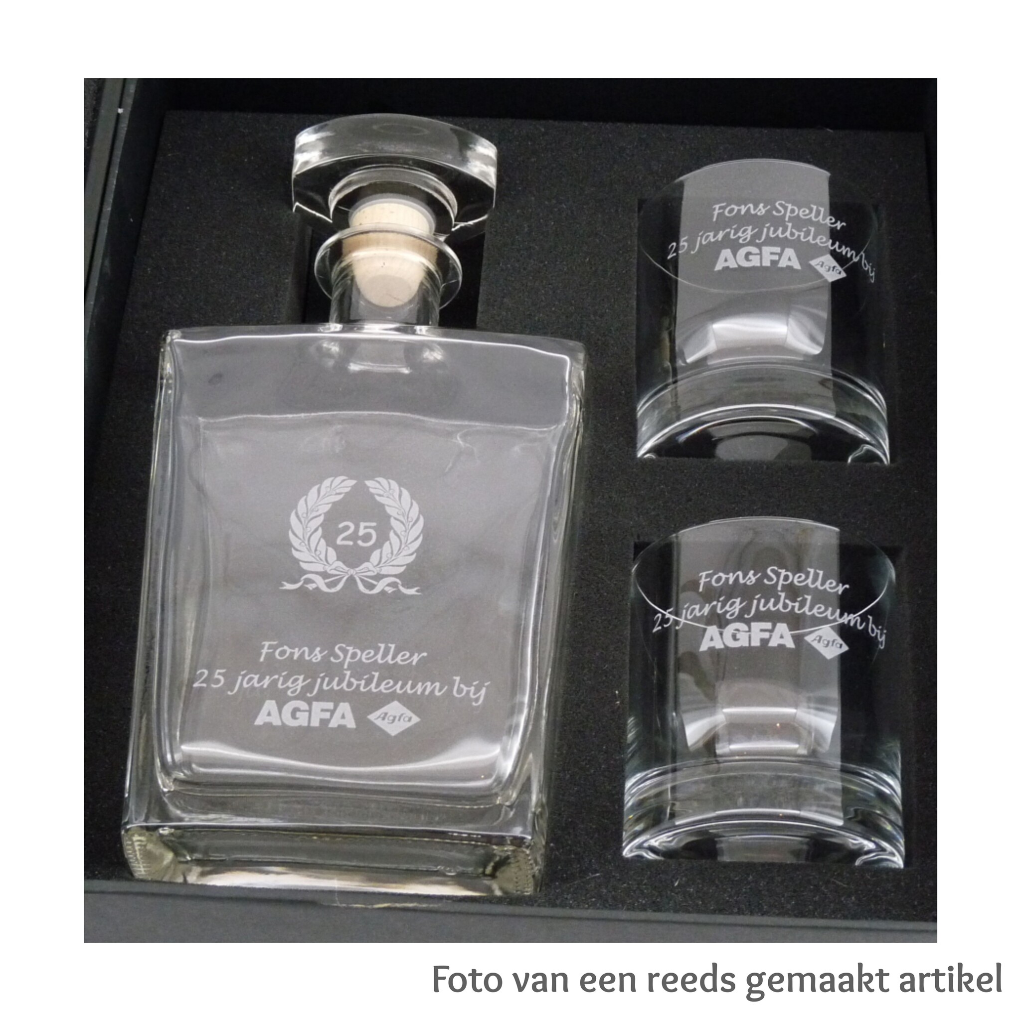 De karaf heeft de afmeting 50x130x250mm (dxbxh). De glazen hebben een doorsnede van 80mm en zijn 90mm hoog. Wij graveren uw persoonlijke boodschap in zowel de karaf als de tumbler-glazen. Deze set wordt geleverd met een bijpassende geschenkdoos.