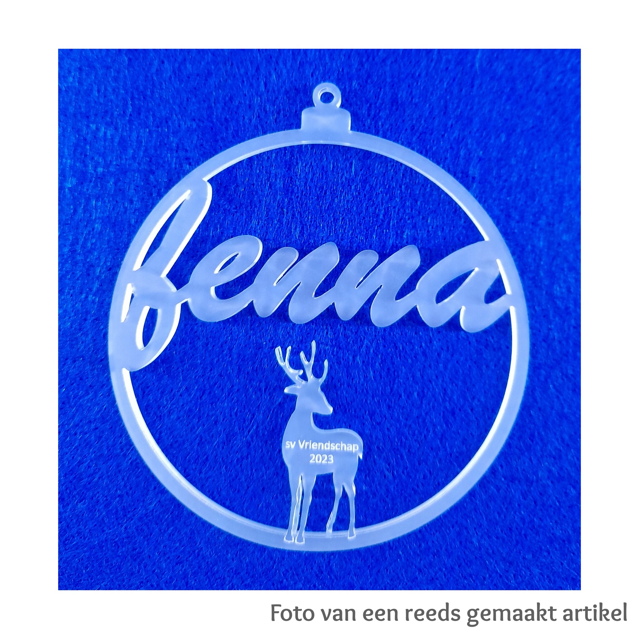 Mooie sierlijke kerstbal met rendier, persoonlijk gemaakt met een naam. Deze kerstbal met naam is gemaakt van mat kwaliteits plexiglas. Lees meer