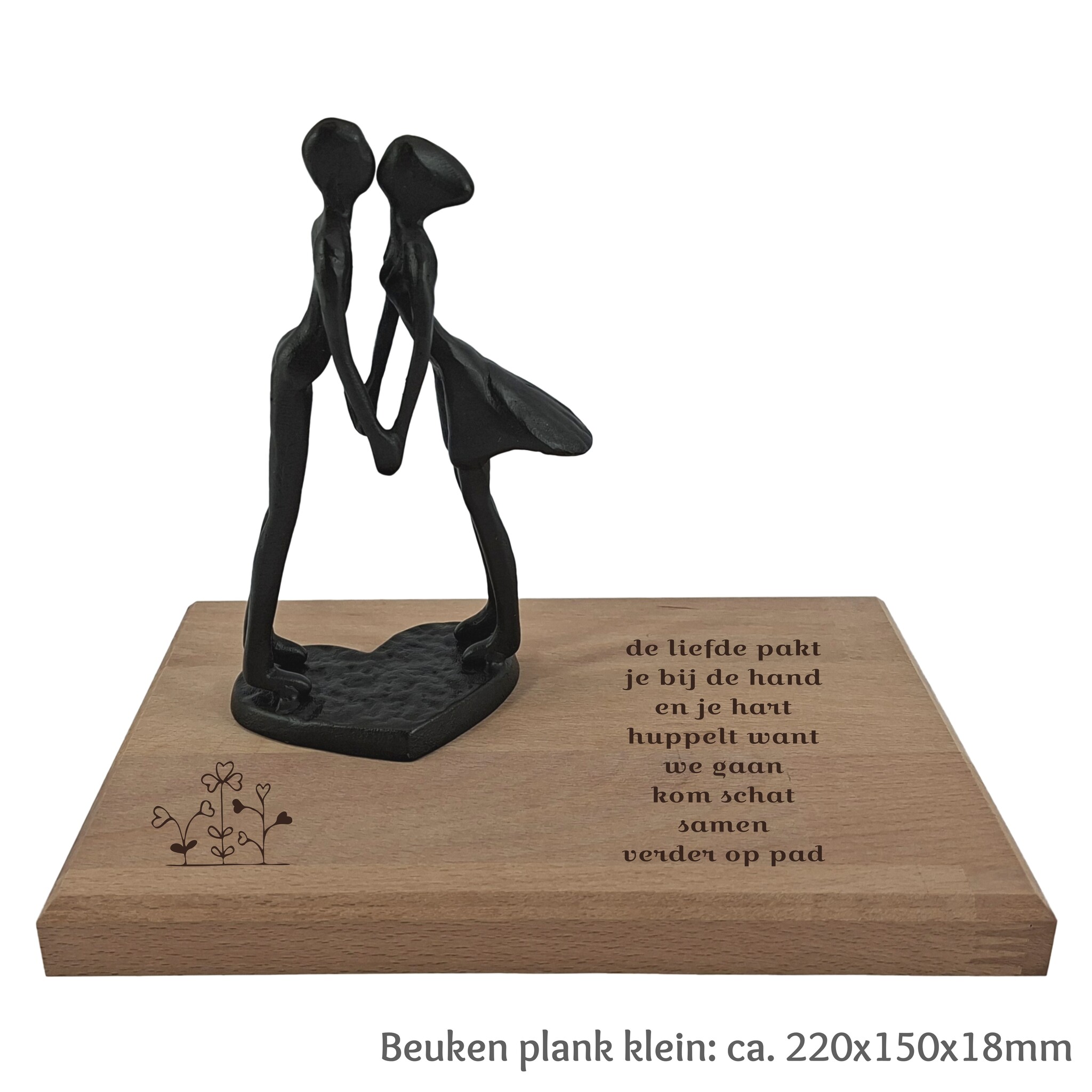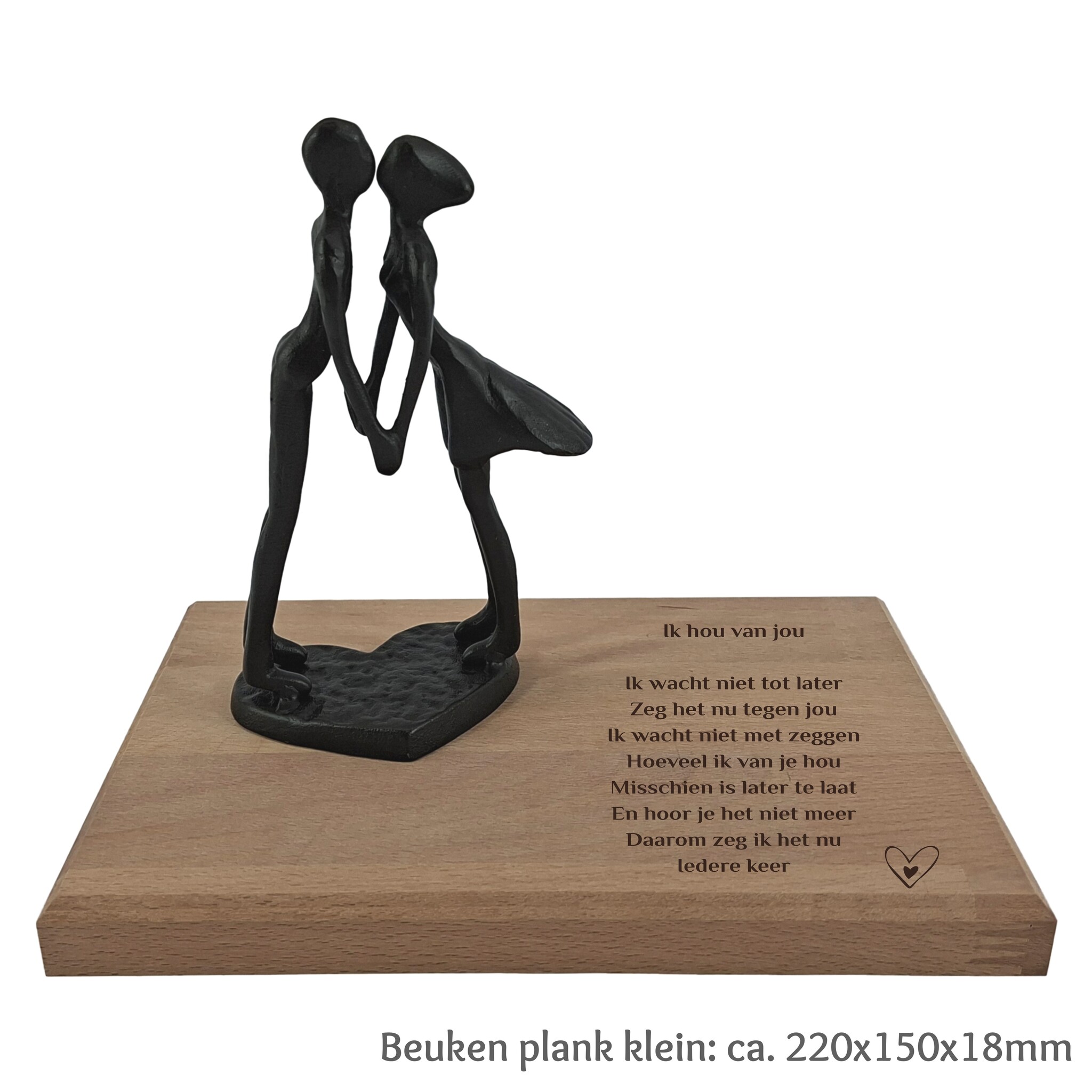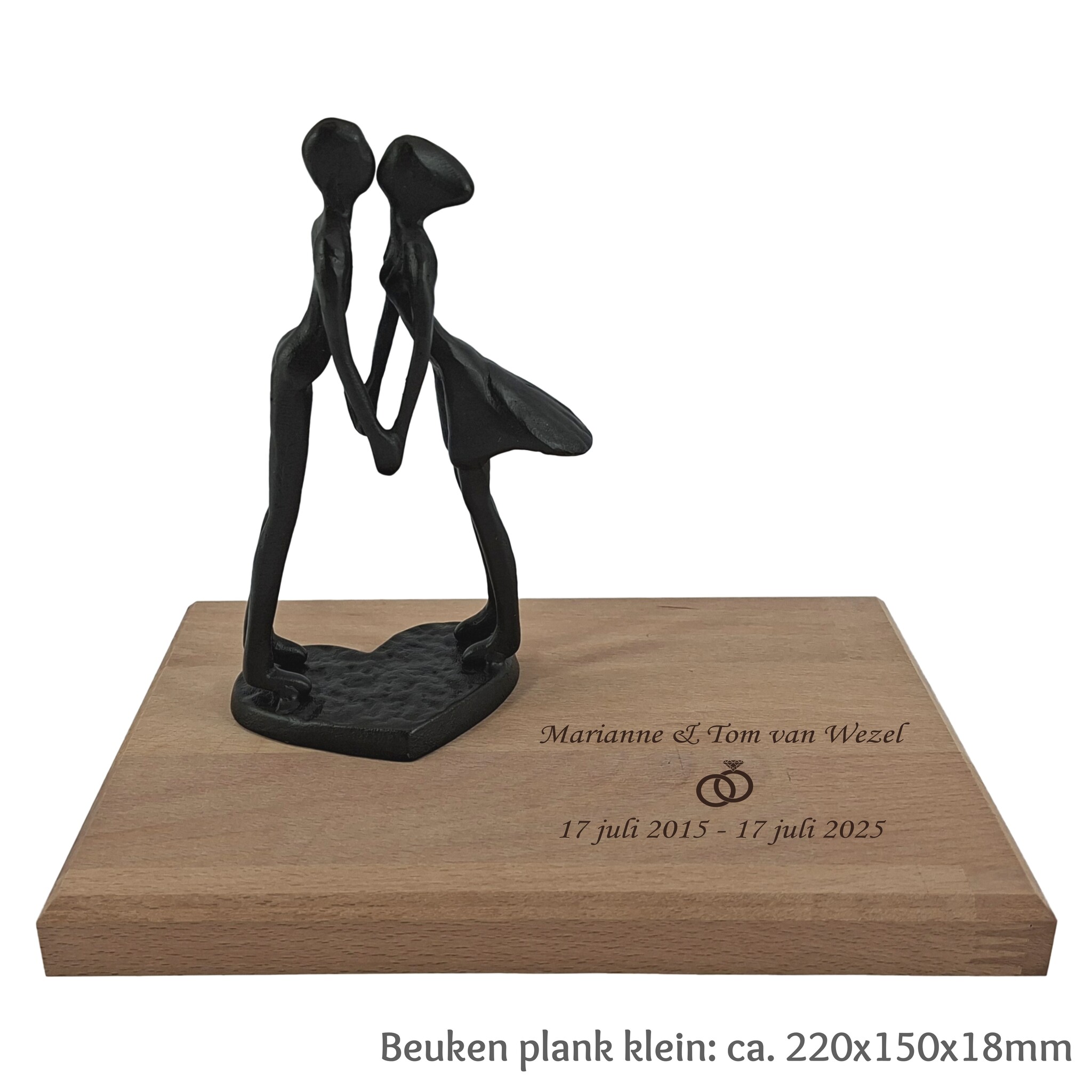 Een liefdevol beeld van een kussend paar, gemaakt van metaal en geplaatst op een beuken plank. Personaliseer het door te graveren voor een uniek en bijzonder aandenken vol warmte en emotie. Lees meer