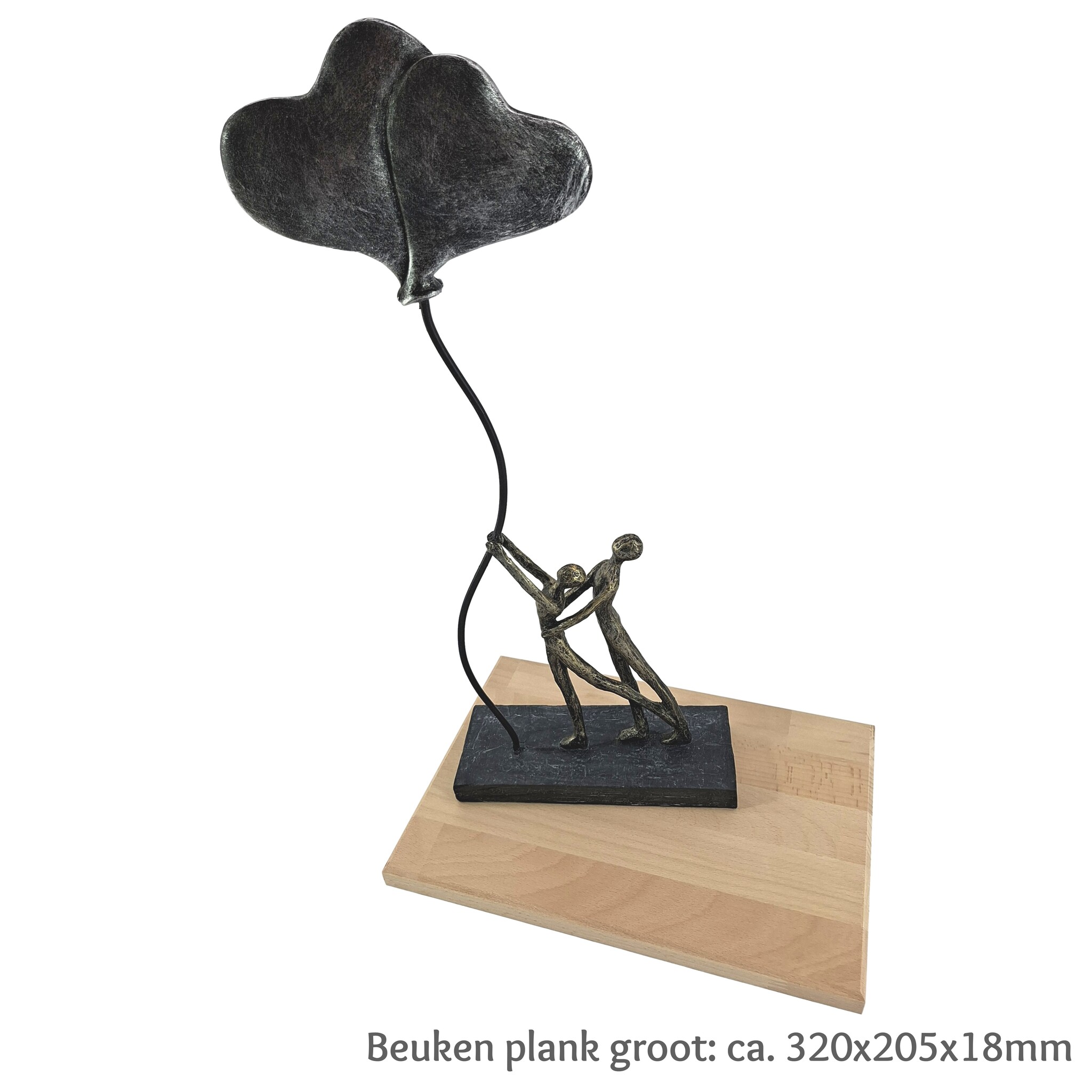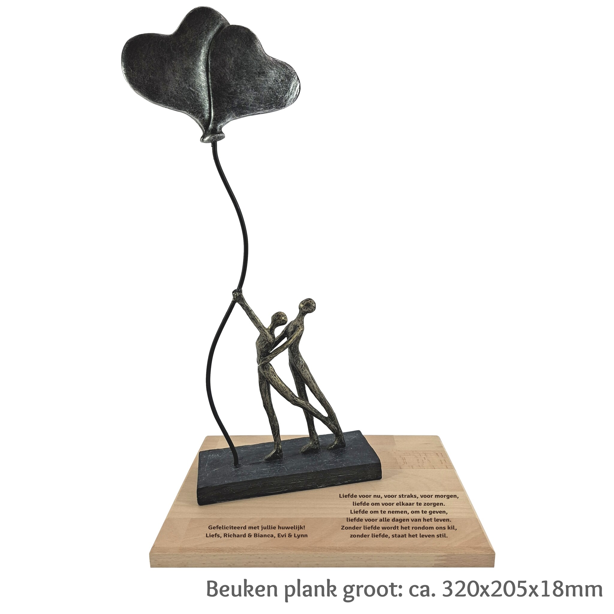 Breng uw gevoelens tot leven met dit prachtige beeld van kunsthars, voorzien van een verfijnde gravure en een sierlijke liefdesballon. Het geheel rust op een elegante beuken plank, wat zorgt voor een natuurlijke en warme uitstraling. Dit liefdevolle kunstwerk symboliseert verbondenheid en tederheid – een perfect cadeau voor een speciaal moment of als betekenisvolle decoratie in uw interieur.