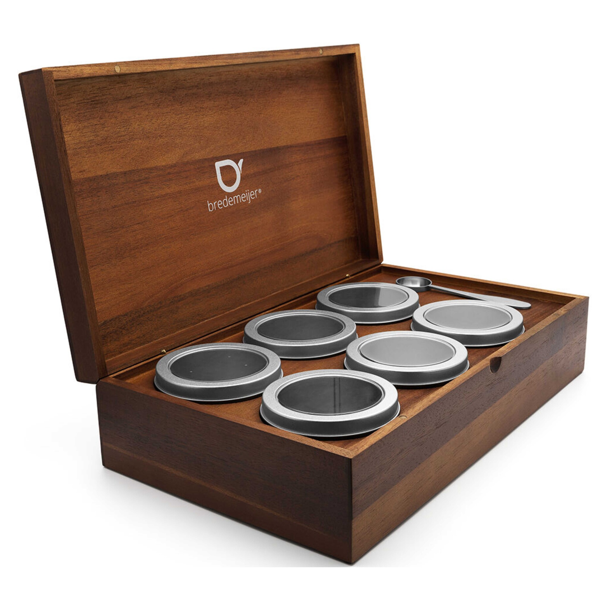 Deze stijlvolle Bredemeijer theedoos van acaciahout wordt geleverd met 6 blikjes voor de thee en een theemaatlepel. Personaliseer het cadeau met een unieke gravure van b.v. een logo voor een persoonlijke touch.