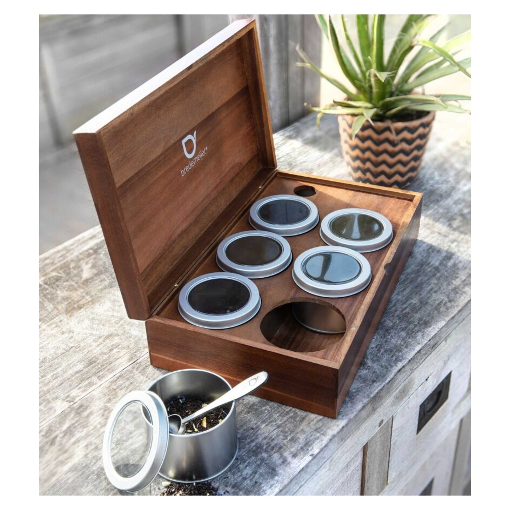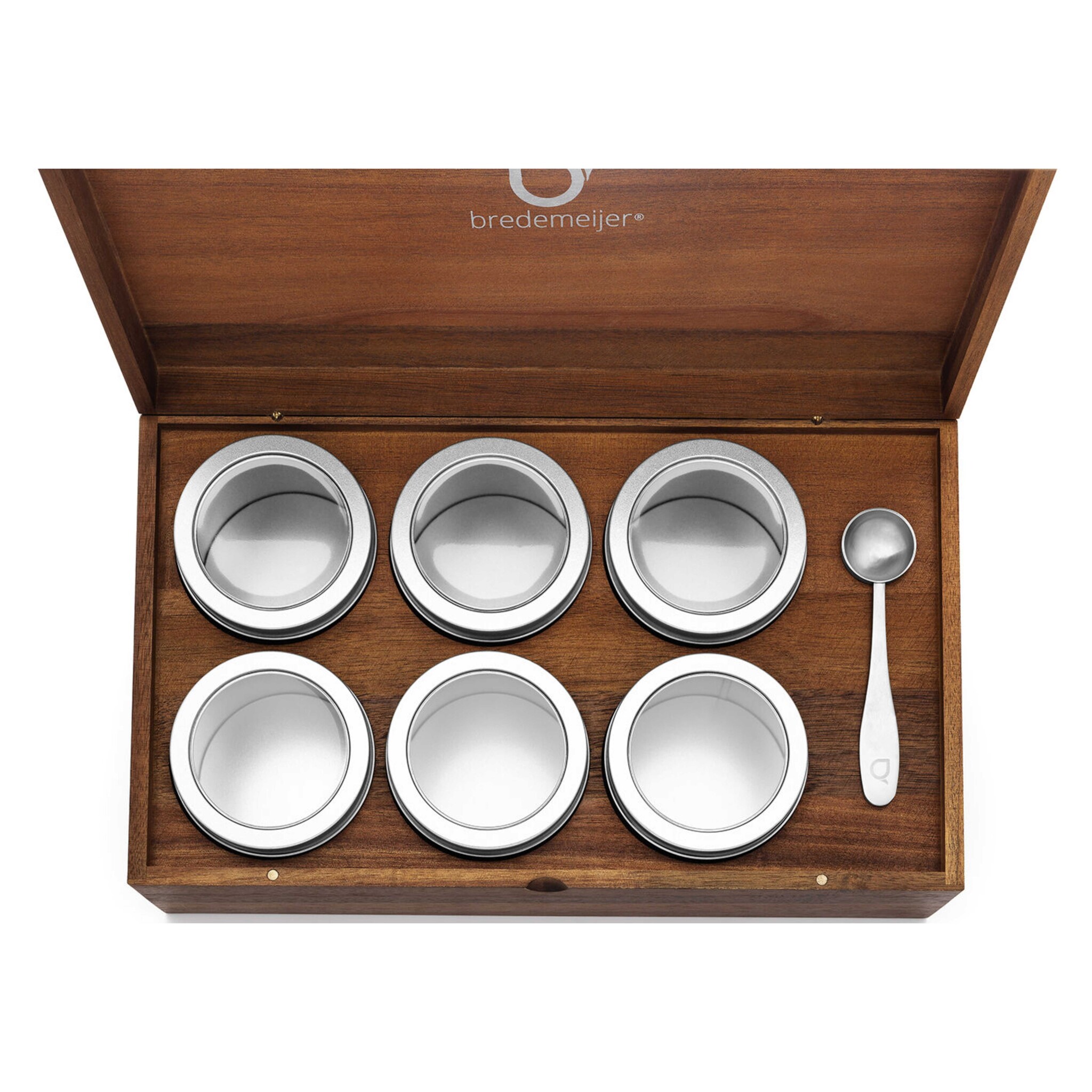 Luxe acacia theedoos met 6 ronde blikjes en theemaatlepel, 208x355x90mm