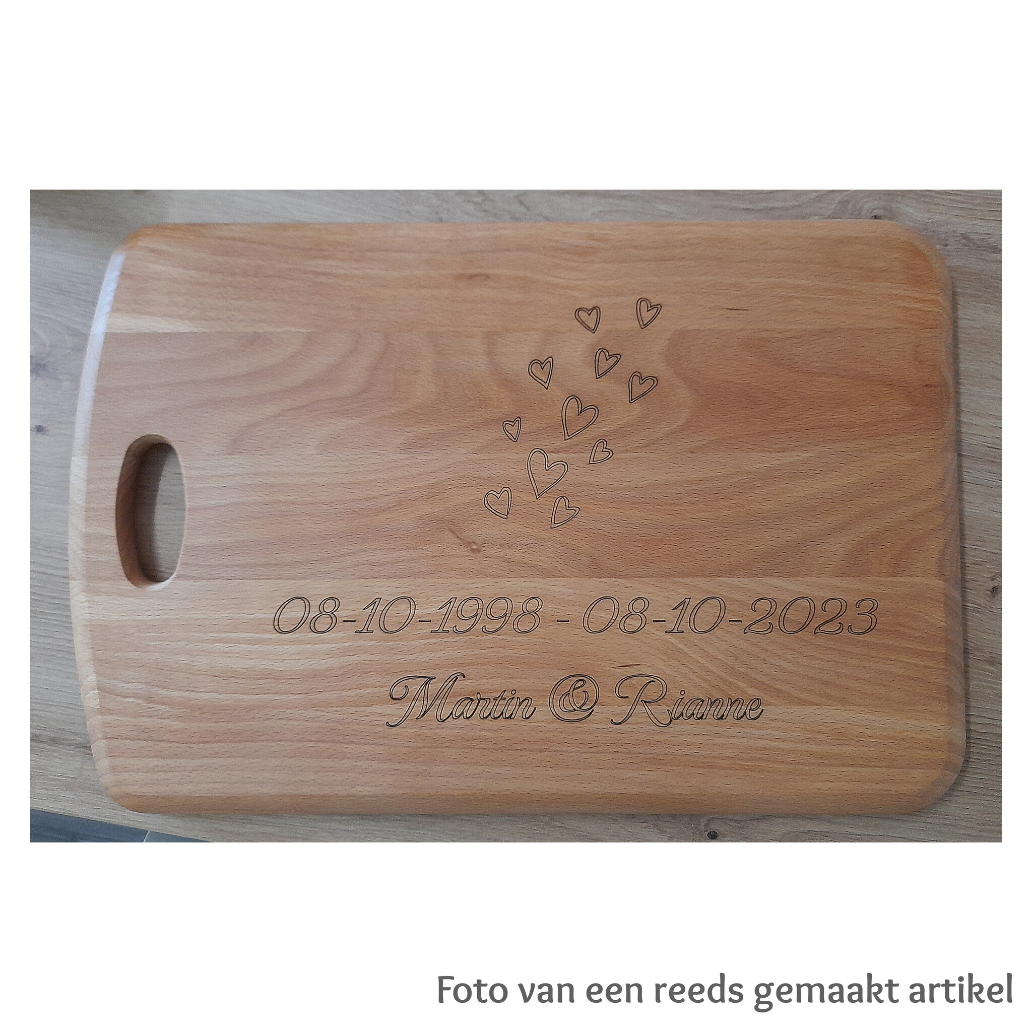 Deze mooie snijplank met handvat kan ook als hapjesplank gebruikt worden. Gemaakt van beukenhout. Persoonlijk gemaakt door het met een tekst en/of afbeelding te graveren.