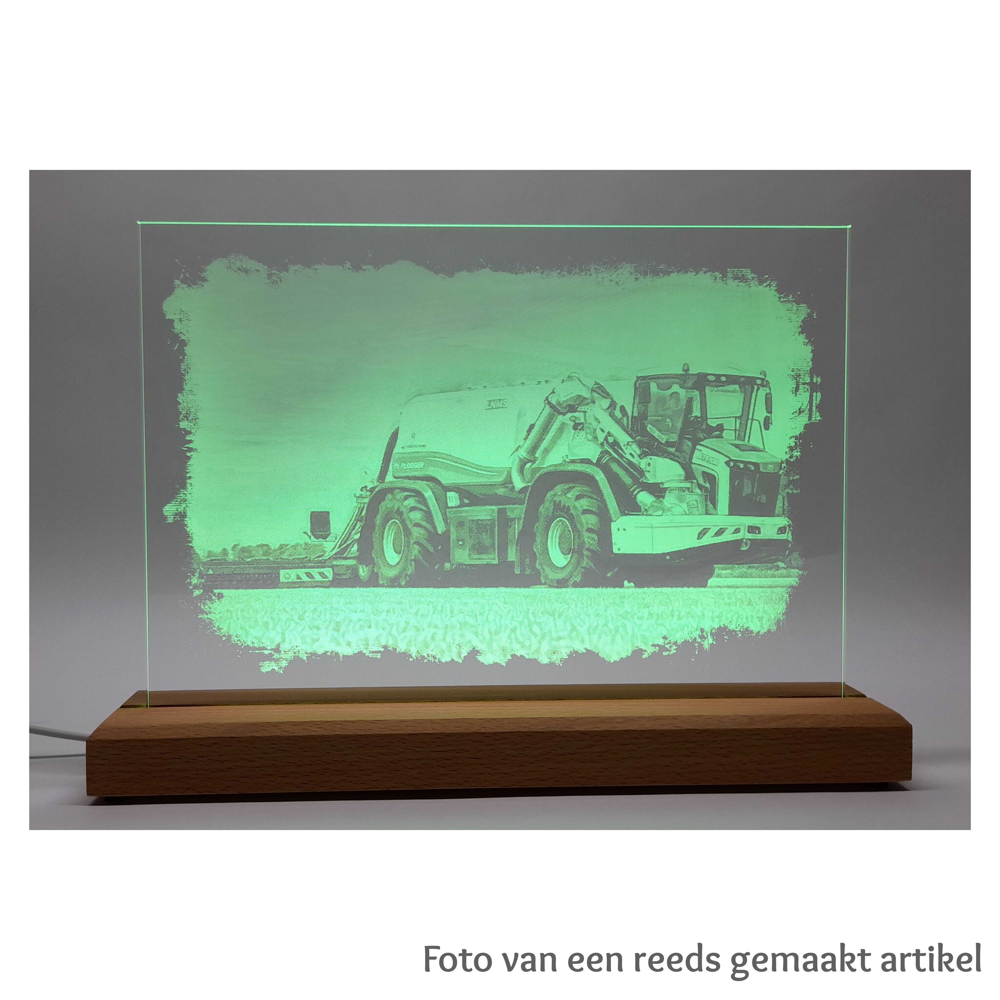Het graveren van tekst, afbeelding, foto of logo op plexiglas (ook wel acrylaat of perspex genoemd) is erg mooi in combinatie met LED-verlichting in de houten standaard. Het plexiglas wordt geleverd met houten standaard en verlichting. Helaas is de walnoten standaard momenteel niet leverbaar.