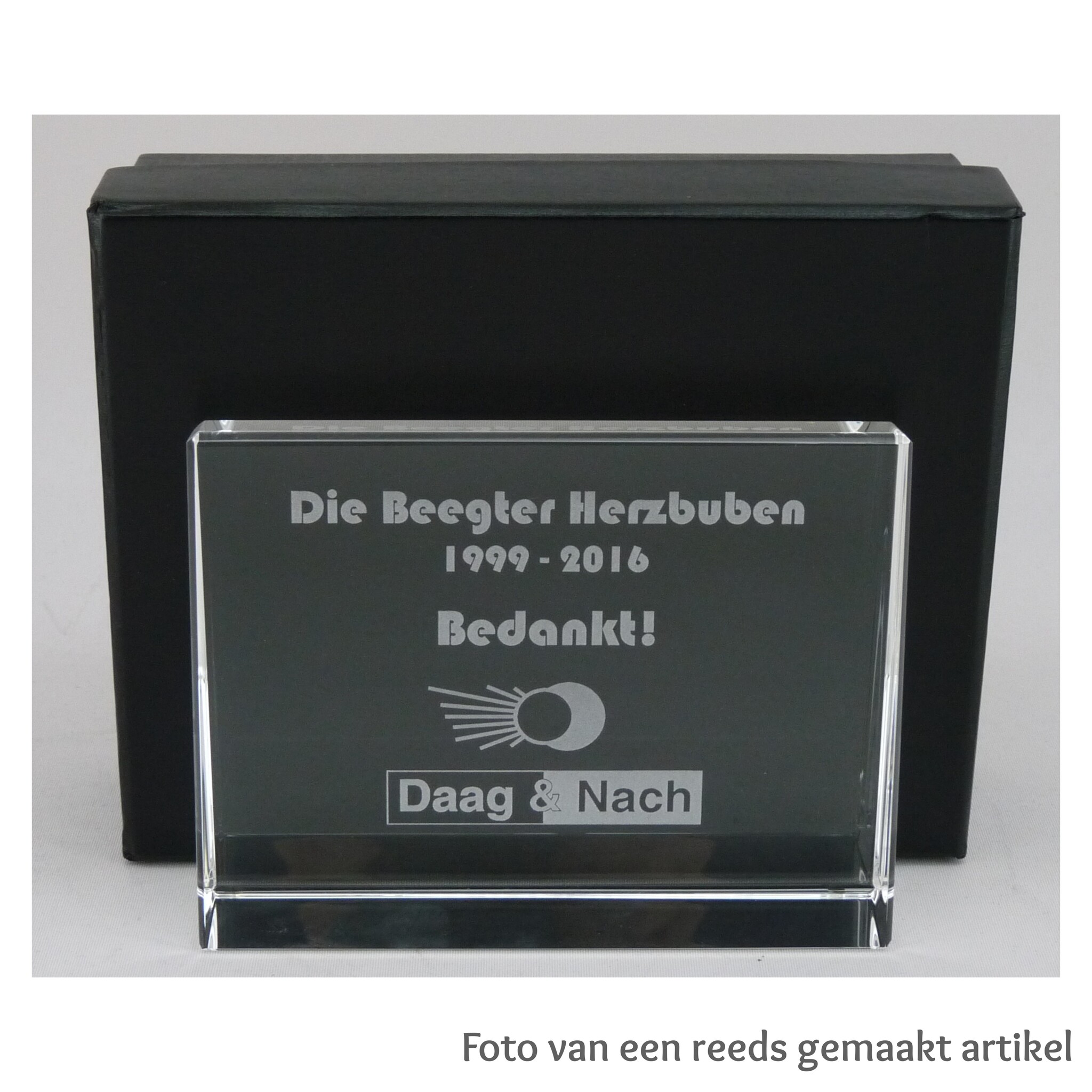Deze glazen rechthoekige staander is aan de onderkant 35mm diep en aan de bovenkant 17,5mm diep. Met een persoonlijke gravure is deze staander een sieraad in de woonkamer. Een origineel cadeau voor een bijzondere gelegenheid. Deze glazen staander wordt geleverd met een bijpassende geschenkdoos.