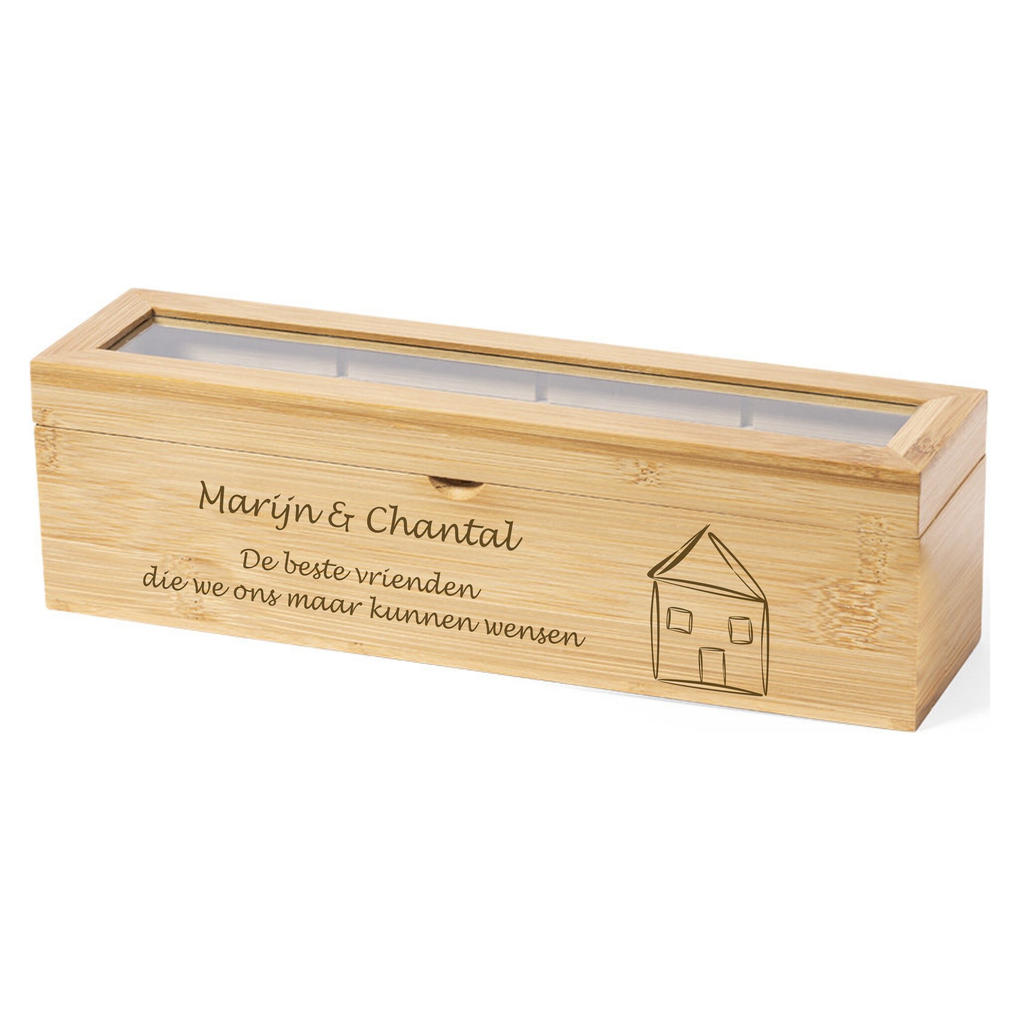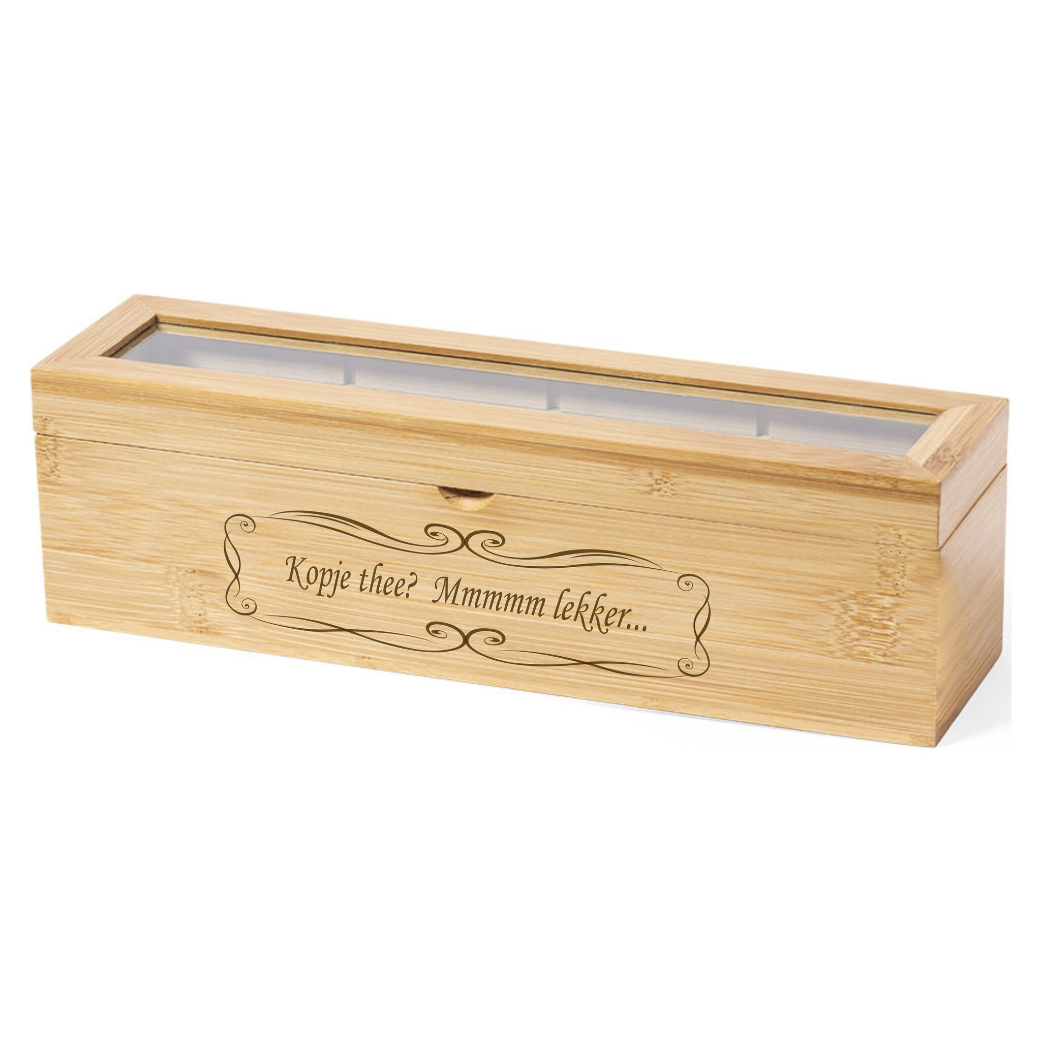 Deze bamboe theekist met 4 vakken biedt de perfecte manier om verschillende theesoorten op een elegante manier te bewaren. De theekist is ideaal om te graveren met teksten, waardoor het een persoonlijk huwelijkscadeau wordt. Deze theekist is wat simpeler dan de andere theedozen welke op de website staan, maar een goed alternatief.